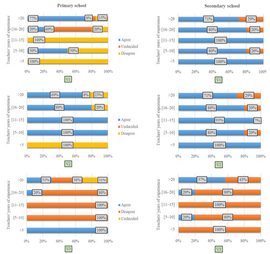- Seniority: Seniority can play an important role in teachers’ representations. According to social learning theory [42], individuals acquire knowledge, attitudes, and behaviors through observation and imitation of others. Thus, older teachers may have been exposed to educational practices that place more emphasis on biodiversity and are therefore more likely to have positive representations of it [29]. This could explain why more experienced teachers show higher percentages of agreement with the survey proposals (Figure 7).