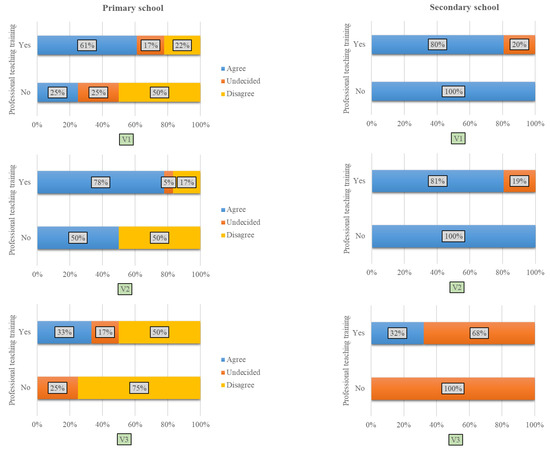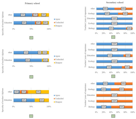 These results highlight that teachers with training in education professions seem to be more in agreement with proposals V1 and V2. In addition, secondary school teachers who have undergone vocational training in specific scientific fields (such as biology, ecology, and geology) seem to have a positive impact on their representations related to biodiversity: they all agree 100% with the V2 proposal.