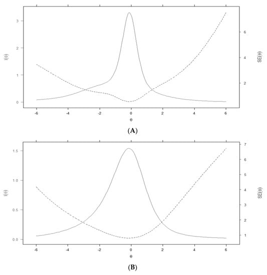 The IRT information function can be expressed through the information curve, a graphical representation that reveals for which range or ranges of proficiency levels, or latent trait, the instrument is particularly valid and for which is not [57]. The information function can also be represented by means of the standard error of measurement, called standard error of estimation in IRT, which is characterised by the inverse of the information curve of the test and allows the analysis of the accuracy of the assessment instrument [57,58,59].