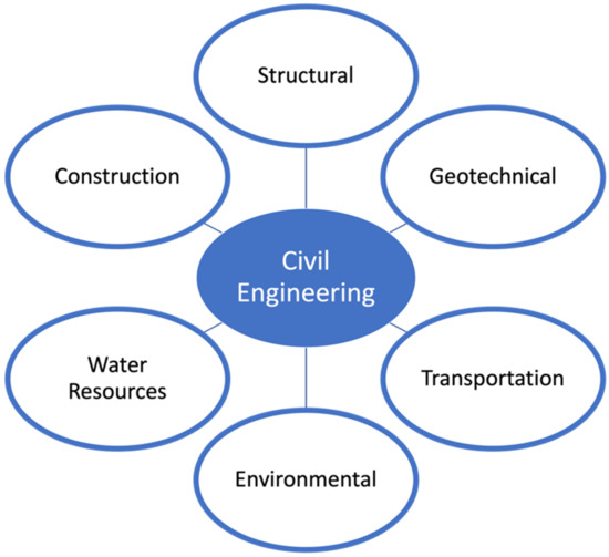 Civil engineering is one of the oldest and most diverse engineering professions. It is the second oldest engineering discipline after military engineering and was defined to separate non-military from military engineering [8,10]. Even though civil engineering has been practiced since the existence of human civilization, it was first defined in 1828 by Thomas Tredgold for the Institution of Civil Engineer’s Royal Charter as the art of directing the great sources of power in nature for the use and convenience of man [9,11].