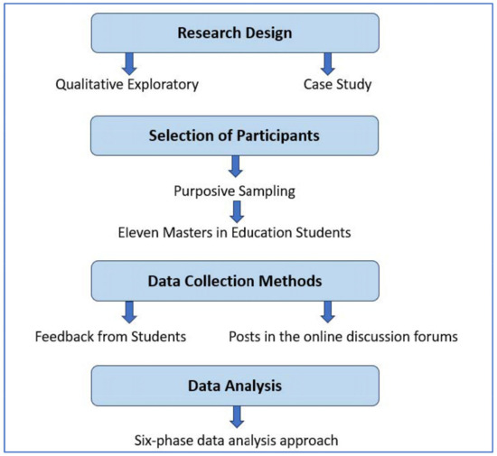 A qualitative exploratory case study design was used for this study as shown in Figure 2. Reid-Searl and Happel [38] argue that a qualitative exploratory research design allows researchers to explore a topic with limited coverage in the literature. Since we did not find specific information on providing guidelines to support a community of inquiry through graded online discussion forums, we believe this design was most suitable.