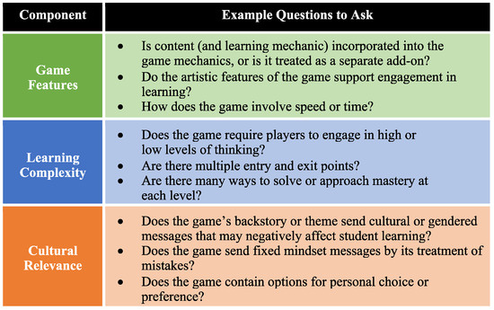 The cultural relevance component of our framework asks teachers to consider how the theme, backstory, or details of a game might influence students’ identity, sense of belonging, and mindset. Finally, we consider how game features, learning complexity, and cultural relevance in digital games fit into a broader context of technological pedagogical content knowledge for games (TPACK-G).