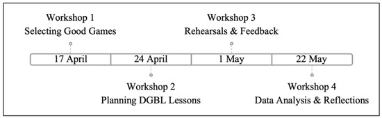 The authors designed the workshop series to develop teachers’ TPACK-G and help teachers implement DGBL that promotes equity. The PD consisted of four three-hour workshops on Saturdays during Spring 2021. We chose to conduct the PD on Saturdays given the participants resided in different time zones and it was convenient for planning three hours for the participants’ and authors’ availabilities. The first three workshops were each a week apart. The final workshop took place three weeks later to allow participants time to implement planned DGBL lessons with their students and then meet afterwards to reflect on data collected during their lessons. A diagram of the workshop timeline is shown in Figure 3.