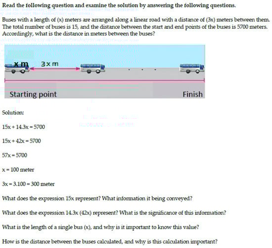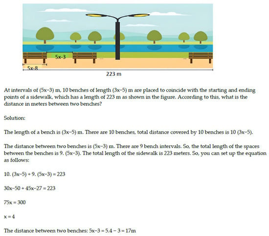 To assess students’ algebraic performance on problems with a first-order unknown, an AAT with eight questions was prepared by four mathematics teachers based on the questions in the students’ school textbooks. The first question was related to the solution of a first-order equation with one unknown, and the other seven questions consisted of problems solved using an equation with one unknown. The test was applied to all 86 participants during one lesson period (40 min) by the researcher. This test was used both to select novice participants and to select questions for the pre-test. The use of this test to choose participants was explained in the Section 3.1. The questions that were difficult for the students were determined by calculating item difficulty indices. Four questions (1, 5, 6, and 8) exhibiting low difficulty indices were chosen for the pre-test. Item difficulty indices were calculated by the ratio of the arithmetic mean of the item scores to the maximum score that could be obtained from the item. The item difficulty indices of these four questions were 0.40, 0.22, 0.19, and 0.14, respectively. The choice of questions with low difficulty indices for the pre-test was intentional. These questions were selected to ensure that the pre-test adequately measured students’ baseline knowledge. By including less challenging questions, it aims to establish a solid foundation for later comparisons with the post-test results. The selection of specific items was based on their alignment with this study’s research objectives and the desire to avoid redundancy for students who were already proficient in the subject matter.