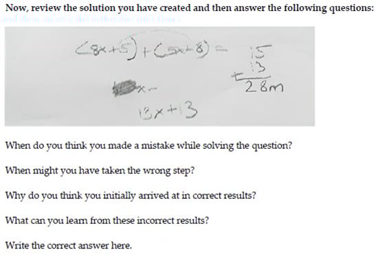 Research has shown that incorporating incorrectly worked examples, either alone or in combination with correct examples, is a form of instructional practice that enhances mathematics learning [7,41,42,43,44]. Incorrect worked-out examples involve solving a problem and intentionally displaying a common error made by a fictional student. When students encounter these incorrect examples, they are typically tasked with studying and explaining the error and sometimes even correcting it before proceeding to solve a similar practice problem. In studies involving erroneous examples, incorrect examples are presented either before [44] or after [41] correct examples. In the incorrect solution steps, students are prompted to identify errors in the solution and asked to explain the reasons for these errors and correct them. This typically involves self-explanation prompts in the worked-out examples to facilitate comparisons.
