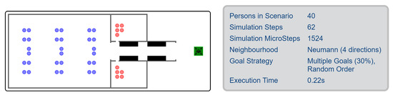 The first simulation, referenced in [95] and visualized in Figure 2, operates on a grid automaton. In this setup, every individual occupies a cell measuring 50 × 50 cm2 and progresses step-wise to a safe external area. The number of steps taken by the last participant can be used to estimate the evacuation time. The model uses the scale cell.