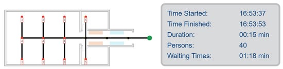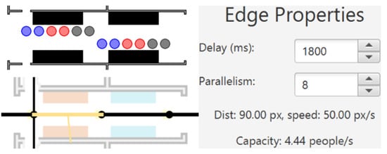 The second simulation, referenced in [89] and depicted in Figure 3, operates on a flow network. Here, each person begins at a node and navigates through edges to reach safety outside the sports hall. The simulation’s duration, influenced by edge delays, can be used to estimate the evacuation time. The model uses the scale . By default, persons are configured to move at 50 px/s.