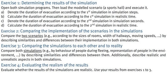 - Greubel, A.; Siller, H.S.; Hennecke, M. Teaching Simulation Literacy with Evacuations. In Proceedings of the European Conference on Technology Enhanced Learning, Heidelberg, Germany, 14–18 September 2020; pp. 200–214. [Google Scholar] [CrossRef]
