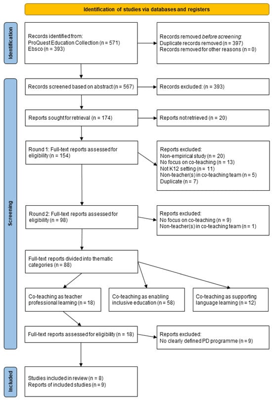 The final phase of the study selection process was to exclude reports that did not focus on a clearly defined teacher professional development programme for improving co-teaching. Based on this criterion, nine reports were excluded. As two of the remaining reports drew from the same study, the final sample comprised eight studies and nine full-text reports.