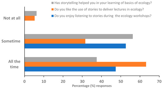Figure 3 showed that 47% (n = 9) of the students enjoyed listening to stories during the ecology workshops all the time. A total of 63% (n = 12) of the students enjoyed the use of stories in the delivery of their lectures in ecology all the time, while 32% (n = 6) replied that they sometimes did and 5% (n = 1) of them replied that they did not at all. A total of 38% (n = 6) of the students replied that stories helped their learning and understanding of ecology all the time, while 56% (n = 9) replied they did learn sometimes. A total of 6% (n = 1) replied that stories did not affect their learning of ecology at all.