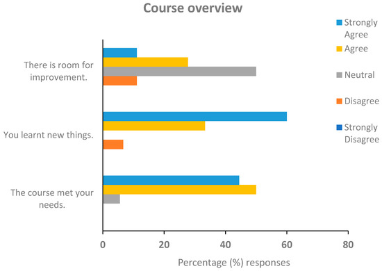 Figure 4 showed that 44% (n = 8) of the students strongly agreed that the course met their needs and 50% (n = 9) agreed, while 6% (n = 1) of the students were neutral. A total of 60% (n = 9) of the students strongly agreed that they learnt new things on the course and 33% (n = 5) agreed, while 7% (n = 1) disagreed. A total of 11% (n = 2) strongly agreed that there is room for improvement, 28% (n = 5) agreed and 50% (n = 9) disagreed, while 11% (n = 2) were neutral.