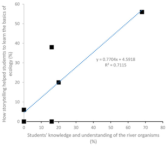 Students’ responses to how storytelling helped them to learn the basics of ecology (%) and their knowledge and understanding of river organisms (%). The R-square value for the variables was 0.7115, indicating high correlation between the variables.