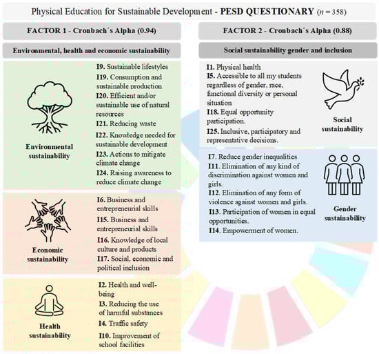 The design of the questionnaire was intended to be framed within the three dimensions of sustainability (social, economic, and environmental). However, the results show that the items are grouped into two factors: (1) environmental, health, and economic sustainability; and (2) social sustainability, gender, and inclusion. Some of the previous instruments show the appearance of three or four factors of sustainability in isolation, with education being included as a fourth factor []. Another instrument that allowed all three dimensions of sustainability to be assessed was the one presented by Gericke and colleagues []. Despite this unique feature, the PESD offers a very high reliability overall (0.95) and for the two factors found (0.94 and 0.88). However, it should be noted that although the results show the existence of only two factors, the questionnaire items allow issues relating to all three dimensions of sustainability (social, economic, and environmental) to be addressed.