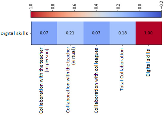 Figure 1 shows the correlation of the total skills versus collaboration in a heatmap. Table 8 presents the complete correlation matrix for each of the 24 skills and collaboration. The following figures display heatmaps of the correlations for the seven skills that exhibited the highest values.