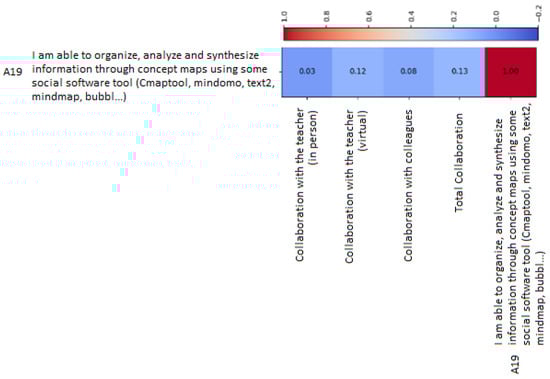 Figure 4. Correlation between skill A18 and collaboration. - A19: I am able to organize, analyze, and synthesize information using concept maps with some social software tool (Figure 5);