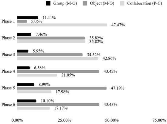 The mediation of the group is perceived as the true winning aspect throughout the activity (Table 10, Figure 2), but particularly during the phase aimed to finalize the first version of the object (M-G, phase#5: 45.95%; “The ability to work even from a distance: the group was able to confront each choice, and no one was entrenched in predetermined positions.”—#171, 10-04, phase#5) and when reflecting on the overall experience (M-G, phase#6: 41.46%): “The always fruitful and stimulating discussion, the willingness and serenity in accepting criticism and proposed changes” (#208, 18-04, phase#6).