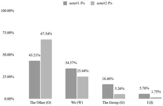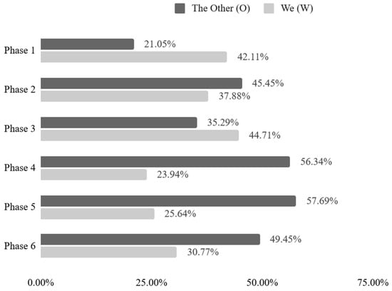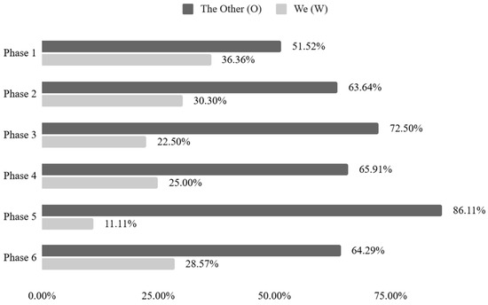 Positioning during time (Table 12, Figure 4) reveals how ‘The Other’ is the core focus in phase#4 (O: 56.34%) and #5 (O: 57.69%) of the activity, whereas ‘We’ and—in a way—’The Group’ are more salient in the initial phases (W: 42.11% phase#1, 44.71%: phase#3;): “We are discussing contents from which we will need to design the whole activity, starting with research questions shared by all group members.” (#203, 22-03, phase#3).
