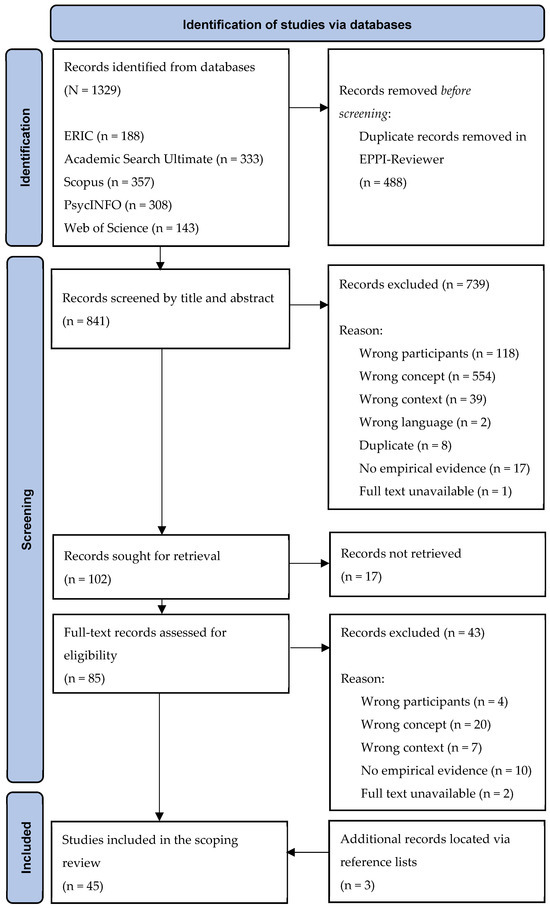 The screening process aimed to exclude studies that did not meet the defined inclusion criteria for mapping. EPPI-Reviewer Web 4 software was used for screening, coding, and reporting. This software ensures that the assessment of the relevant literature is systematic, structured, and transparent [31]. Both title and abstract screening and full-text screening were performed by two colleagues, independently, and then compared in EPPI-Reviewer to reach a joint decision in the event of disagreement related to the exclusion of studies. Figure 1 illustrates the identification, screening, and inclusion of studies.