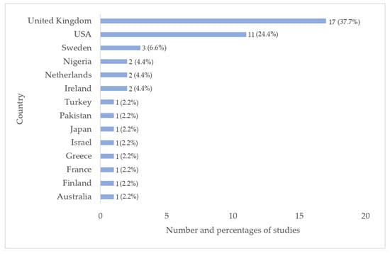 Number and percentages of studies conducted in the different countries (single coding, n = 45).