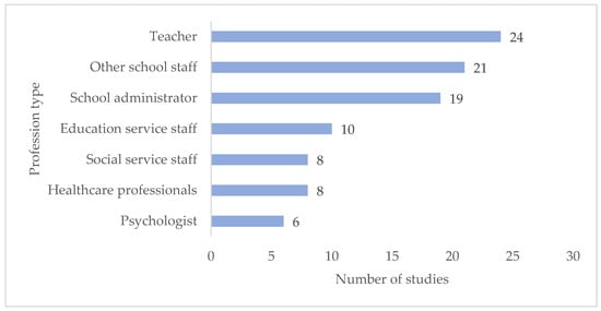 Almost half of the studies included only one type of professional (twenty-one studies) in their sample while eleven studies included two profession types. The remaining studies included three (four studies), four (five studies), five (three studies), or six (one study) types of professions in their sample. In addition, a small proportion of these studies included the perspectives of students (nine studies) or parents (eight studies), of which four studies involved the perspectives of students, parents, and professionals at once [20,32,33,34].