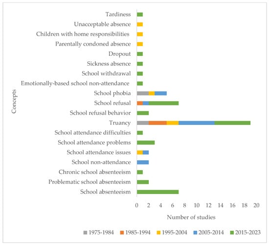 Some of the concepts were more frequently used in recent studies (e.g., school refusal, school attendance problems, and school absenteeism) while others were a bit more prevalent in less recent studies (e.g., school phobia). Some concepts (e.g., truancy) have been steadily employed throughout the years.