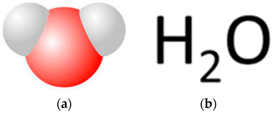 Two different ways of representing a water molecule. In (a), a water molecule is presented as a space filling model. The red “ball” represents an oxygen atom, and the white “balls” represent hydrogen atoms. In (b), a representation of a water molecule’s molecular formula is presented. The letter “H” symbolically refers to the hydrogen atom, the number “2” refers to the number of hydrogen atoms in the molecule, and the letter “O” symbolically refers to the oxygen atom.