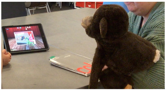 Instead of staging a more fixed interview setting with ready-made questions only, the aim with the video-stimulated recall interviews was to encourage the pupils to comment on what they had done, and to comment on their intentions behind their digital animation. This was done to support the pupils to better recall how they had reasoned during a specific episode—for example, see [51,52,53,54]—in this case how they reasoned when creating the digital animation. However, to be able to have qualitatively fruitful discussions with children, one needs to shift towards engaging with children’s own cultures of communication [55]. Since young children often play with toys like stuffed animals, we decided to use Affe the monkey and let him “talk” to the pupils and “ask” them questions (see Figure 3). We chose to conduct the video-stimulated recalls in pairs and in small groups as a way of making the children feel comfortable and safe together with someone they knew. Another reason for this choice was to make sure that each pupil would have at least one peer to interact and discuss their experiences with. Hence, this was a way of creating a comfortable and productive context for the interviews, and it is also reduced the asymmetry of power between the interviewee and the interviewer [56].