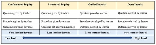 The term inquiry may appear to indicate a single approach; however, it may be implemented using a range of more guided, to more open methods. The inquiry cycle includes asking testable questions, designing and carrying out investigations, analyzing and interpreting data, drawing defensible conclusions, and fashioning explanations that support a deep understanding of scientific content []. These methods vary depending on who determines the question, the procedure, and whether the student knows the outcome. The more teacher-centered the method, the lower the level at which it is considered. On the contrary, the more student-centered the method, the higher the level of inquiry in the instruction []. Figure 2 shows this continuum of inquiry methods. Although guidance from the teacher exists on the lower end of the continuum, it is a necessary component of inquiry instruction []. Many of these strategies require teacher scaffolding and support as students begin using the practices.