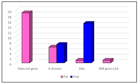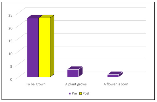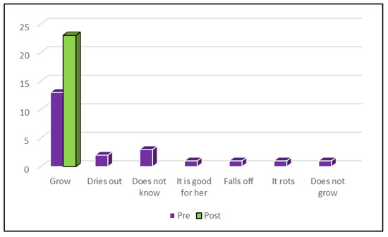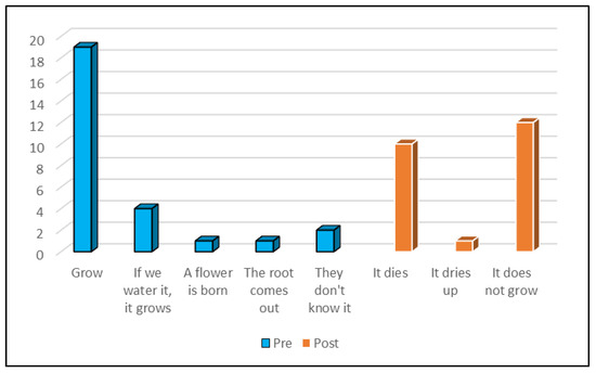 The question “What will happen if we water it?” elicits responses (Figure 4) that generally align with varying degrees of scientific precision. Among all the responses, 23 reflect the pupils’ understanding that the provision of water is beneficial for the plant’s development. They infer that a plant forms or grows, but without specifying that it is the plant that grows from the root rather than the seed (“it will grow” and “a plant comes out”). Furthermore, there is limited reference to the germination processes. They do not mention the morphology of the plant (the root) as part of the plant’s growth, and it remains unclear whether they understand that it is a component of the germination process since they describe a plant as “coming out”, as though it were something magical. One response demonstrates a strong anthropocentric influence, stating, “a flower comes out”, with imprecision regarding plant processes.