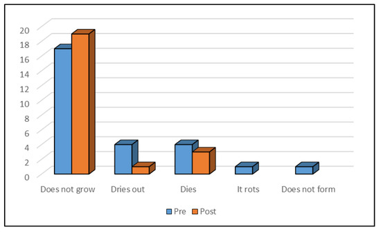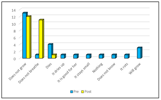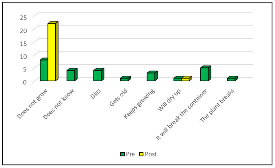 Responses to the question “What will happen in a few days if we plant a seed (beans and lentils) without watering and light?” before the intervention (Pre) and after the intervention (Post).