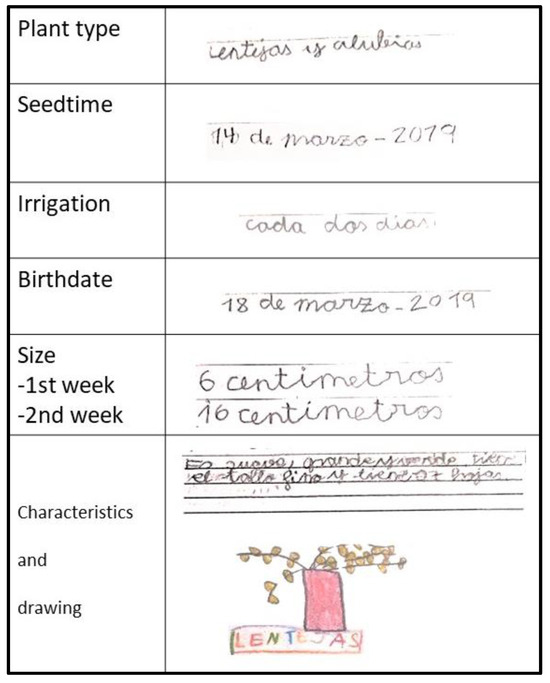 Respecting the experimental procedures, in which the students sowed bean and lentil seeds, the pre-service teacher organized the class into working groups of 5–6 students, randomly selected. Individual interviews were conducted at two points in the study: before (Pre) in the exploratory stage and after (Post) in the evaluation stage. These interviews consisted of a series of linked questions, including cognitively demanding ones [36,37]. They primarily served to obtain hypotheses from students, who, at the age of 6, still possess limited skills for independent articulation. Additionally, these interviews aimed to assess argumentative capacity. Group activation questions were posed prior to the beginning of the intervention, and synthesis and learning verification questions were asked at the end of the intervention. In addition to the data obtained, we conducted a qualitative analysis of the materials (worksheets) produced by the working groups, as well as the students’ responses, employing content analysis techniques [38]. For this purpose, a categorical sum was initially carried out, establishing categories (in parallel to a direct prior interpretation of the meaning) whose taxonomy was based on responses in the same sense (positive, negative, or similar meaning), responses with semantic similarity, responses with the same variables involved, and responses (on the worksheets) with a degree of closeness to the required result. Subsequently, the content analysis of the categories was carried out based on the criteria of correlation of the categories with previous persistent ideas, ideas modified after intervention, correct result from a scientific point of view, volume of contents involved, implication of the answers, quality of argument, and, in all cases, comparing with other cases and existing information in the literature.