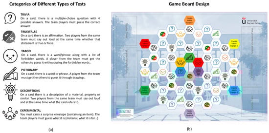 Each student from the Materials Science and Engineering subject of the Mechanical Engineering Degree submitted 6 tests/questions (one test from each of the question categories of the game) for the development of the board game. In this way, more than 90 different tests for each test category were provided. These questions/tests were then corrected by the teaching staff, designed, and printed for the production of the game. The printed game board and details of some of the printed test types are shown in Figure 2.