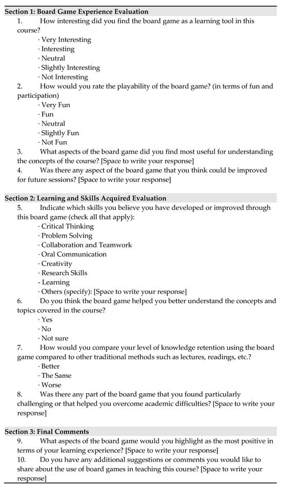 In this specific study, we selected a mass market game [22,23,24] to ensure that 100% of the students had prior experience with the game dynamics. First, the simplicity and accessibility of mass market games allow students from different backgrounds and experience levels to participate without needing to overcome a steep learning curve. Games like Party & Co. (Madrid, Spain). are intuitive, easy to understand, and quick to implement in a classroom setting, which prevents students from spending time learning complex rules, as is often the case with role-playing games. This ensures that the focus remains on the concepts and skills being taught, rather than on the mechanics of the game itself. Additionally, mass market games encourage direct social interaction among students, which is especially important in educational environments. Games like Party & Co. facilitate communication, teamwork, and collaboration, all of which are fundamental skills in higher education. While role-playing games also promote these competencies, they tend to focus more on narrative immersion and character development, which could distract from the specific educational goals. Furthermore, mass market games are typically easier to adapt to a variety of contexts and subjects. Party & Co., for example, can be easily modified to include questions or activities related to academic content, making it a versatile tool for reviewing concepts, memorizing information, or strengthening specific skills. In contrast, role-playing games require a more elaborate structure and time for developing stories and characters, which may not be feasible within the constraints of a university class, where time is limited. Finally, mass market games like Party & Co. create a playful and competitive atmosphere without the narrative depth of role-playing games, allowing for a balance between enjoyment and a focus on academic content. This balance may be harder to achieve with role-playing games, which tend to be more open-ended and require a higher degree of improvisation and creativity—elements that, while valuable, may not be suitable for all students or subjects. As Sousa [23] explains, modified games can enhance communication, collaboration, and idea generation in work groups.