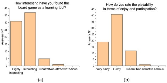 The analysis of the student surveys of the board game experience shows that 68 out of 74 students considered the activity to be very interesting or interesting as a new learning tool, which represents 91.9% of the students. Only one student found the board game uninteresting (Figure 5a).