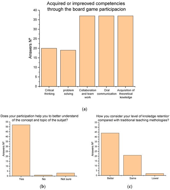 Results related to the evaluation of learning and acquired competencies are presented in Figure 6a. The competencies that the students consider having acquired through the board game were as follows: (i) critical thinking; (ii) problem-solving; (iii) collaboration and teamwork; (iv) oral communication; and (v) the acquisition of theoretical knowledge.