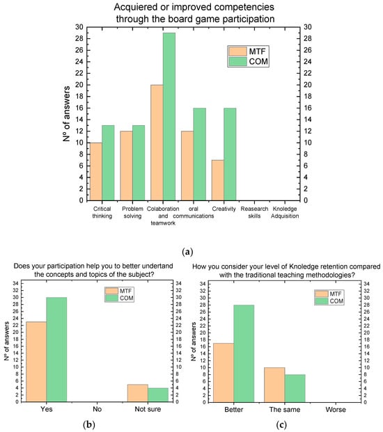 A total of 79.6% of the students (23 out of 29) considered that the board game helped them to better understand the concepts and topics covered in the course (Figure 8b) and 62.1% of the students (18 out of 29) considered that their level of knowledge retention improved when using the board game compared to other traditional methods (Figure 8c). These data are also similar to those obtained with the other group evaluated. When the students were asked about which aspect of the board game they found particularly challenging or helped them to overcome academic difficulties, most of the students referred, again, to the different types of questions available since they promote different ways of dealing with theoretical knowledge. Finally, they emphasized the use of teamwork as a tool for studying the subject, as well as indicating their increased motivation in carrying out this type of novel activity.