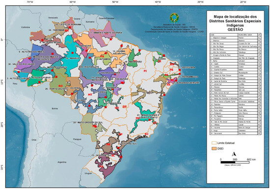 - Ministério da Saúde. Saúde Indígena. Available online: https://www.gov.br/saude/pt-br/composicao/sesai/saude-indigena (accessed on 29 July 2024).