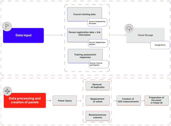 The prototype was developed through a process structured in two phases: 1st—data input, and 2nd—dashboard processing and creation, as shown in Figure 2. In the Data Input phase, internal documents (course monitoring spreadsheet, people registration spreadsheet, and training evaluation response spreadsheet) with data on the training of health professionals were analyzed.