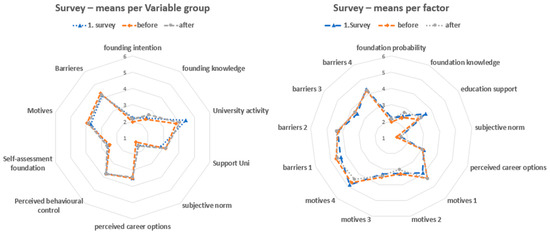 Figure 2 provides an overview of the respective mean values of the three surveys (the comparative survey, and those conducted before and after entrepreneurship education).