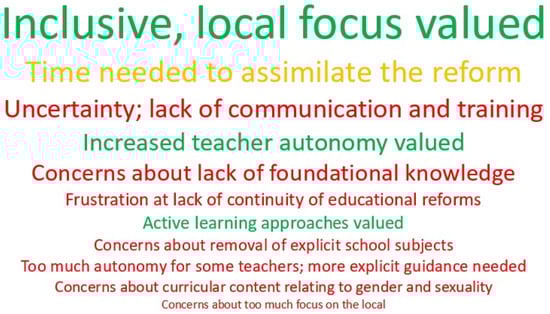 In the sub-sections that follow, we begin by providing a general overview of the overall perspectives on the reform (Section 3.1). We then focus on participants’ perspectives on active learning approaches (Section 3.2), before examining participants’ perspectives on inclusive, local approaches (Section 3.3). We continue by discussing participants’ perspectives on increased teacher autonomy (Section 3.4), and we conclude by presenting their perspectives on the process of reform implementation (Section 3.5). A selection of quotes has been included to support each point made. Due to limitations of space, it has not been possible to include quotes for all points, but we have endeavoured to include excerpts that are particularly illustrative of the themes discussed.