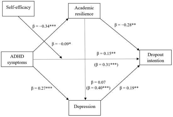 The tested model assessed the indirect effect of ADHD symptom scores on university dropout rates, considering the mediating roles of academic resilience and depression. Furthermore, the model explored the direct effect of ADHD symptoms on dropout intention and whether it was mediated or moderated by self-efficacy.