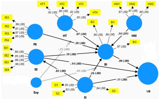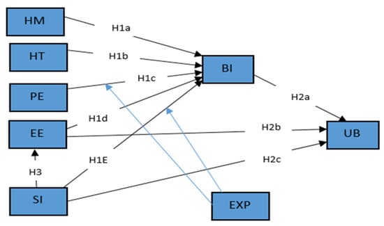 Based on the discussion in the previous sections and the framework of this study, namely the UTAUT2, the researchers developed the proposed model (Figure 1). The figure below represents a conceptual research model examining the factors influencing behavioral intention (BI) and its effect on use behavior (UB). The model includes constructs such as hedonic motivation (HM), habit (HT), performance expectancy (PE), effort expectancy (EE), and social influence (SI), each hypothesized to affect BI through paths H1a to H1e. Additionally, experience (EXP) is posited to have direct influences on BI and moderate other paths, as indicated by the blue arrows. The relationships between BI and UB are defined by paths H2a, H2b, and H2c. SI also has a direct relationship with EE through H3. This model seeks to investigate how different motivational, behavioral, and experiential factors drive behavioral intentions and the actual usage of a system or technology.