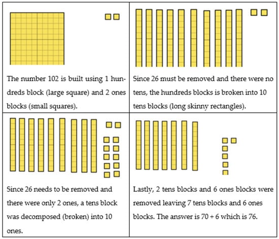 The purpose of this section is to provide an example of how the different aspects of TPACK are enacted in a mathematics classroom. The context is a second-grade classroom, where the teacher has asked students to solve the problem “102 take away 26” (often written as “102 − 26 = ___”). A commonly used tool is physical place value blocks or virtual place value blocks. Figure 2 shows a process that students used to build 102 and use the virtual place value blocks to show how to solve “102 take away 26”.