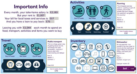 On Day 1, pairs of students were randomly assigned a job with a weekly salary, a housing location with monthly housing costs, and transportation (truck with low gas mileage, car with high gas mileage, or no car). The students made a budget and discussed ways that they could possibly earn or save more money in pairs and during a class discussion. The teacher’s role was to introduce the activity and facilitate discussions among classmates. On Day 2, the students were given the opportunity to play The Budget Game (Figure 4), which is an online, internet-based budget simulation (https://natwest.mymoneysense.com/students/students-12-16/the-budget-game/, accessed on 1 June 2024). The students worked in pairs to play the game over a 45 min period. During this time, the students were required to keep track of all of their expenses and earnings on paper.