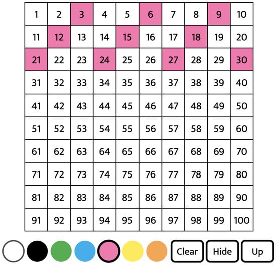 Mrs. Wilson gave her students whiteboards and markers to explore the problem in groups of three or four. The students worked on the task as Mrs. Wilson checked in with various tables and asked questions. After the students had found a few possible answers, Mrs. Wilson had the students open up their Chromebooks and pull up an interactive hundreds board (https://toytheater.com/hundreds-chart/, accessed on 1 June 2024, Figure 5). In Mrs. Wilson’s planning meeting with other third-grade teachers, the website was shared by another teacher as an activity where students could just practice skip counting by making patterns on the website. Mrs. Wilson decided to use the website to support her students’ work on the word problem.