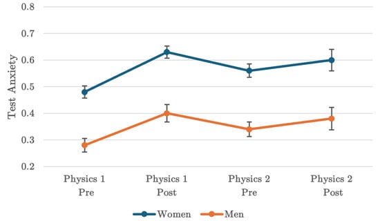 Average test anxiety scores of men and women from the start of Physics 1 to the end of Physics 2. Error bars represent standard error, and test anxiety is on a 0–1 scale.