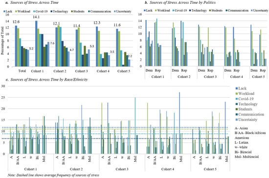 Overall, when looking across racial and ethnic groups, COVID-19 was the largest source of stress for Black and African American participants (11.5%). For Black and African American school personnel, COVID-19 was most frequently reported as a stressor during the Insurrection Cohort (January–February). Conversely, COVID-19 was the lowest source of stress for Asian participants (6.5%). Latinx (7.2%) and Biracial (6.5%) school personnel were least stressed by Students, while Multiracial school personnel were most stressed by Students (10.5%). Overall, considering Leadership as a source of stress, Biracial (7.7%) and white (7.4%) school personnel were highest compared to other racial and ethnic groups, indeed Multiracial participants were least likely to report Leadership as a stressor (4.4%). Multiracial participants were the group that reported the highest levels of stress from Technology (8.8%), almost double the total average. Finally, during the Vaccine Rollout Cohort, Multiracial participants spiked on reporting stressors of COVID-19, Uncertainty, and Leadership.