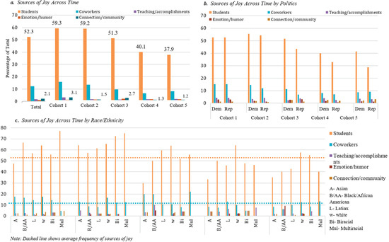 Both white and Asian participants most often reported Coworkers as a source of joy. Black and African American school personnel were the group highest on reports of being brought joy by Teaching and Humor. The lowest sources of joy for Multiracial participants were Teaching, Humor, and Community. Latinx participants reported the highest percentage of being brought joy by Community (2.8%) while Black and African American personnel were lowest (0.9%). For school personnel in all states, sources of joy were similar. Students were overwhelmingly the primary source of joy although marginally more so for those in Democrat states (Figure 4b). The same pattern followed for Coworkers. However, the remaining primary sources of joy were comparable for both groups and all cohorts. Across the year, common sources of joy gradually decreased.