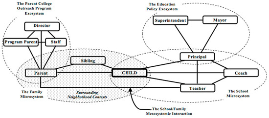 Adapted from Neal and Neal [19], Example Illustrating a Networked Model of Ecological Systems with Addition of Parent College Outreach Program Exosystem and Surrounding Neighborhood Contexts.