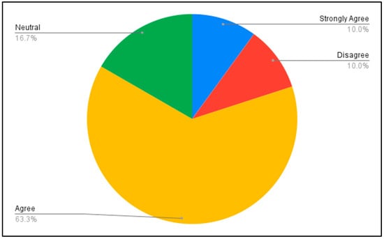 Figure 4 shows that most respondents (63.3%) agree that the simulation tool provides multi-user, real-time laboratory training, while 16.7% are neutral, 10% strongly agree, and 10% disagree. Packet tracer has both real-time and multi-user features. In real-time mode, the network device behaves the same way it would have with real devices. The multi-user option allows students at different locations to work together on the same project or in the same lab [61].